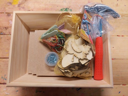 Dit alles zit in een grenen houten bak van (onderkant 16,5x25,5x7,5 cm)