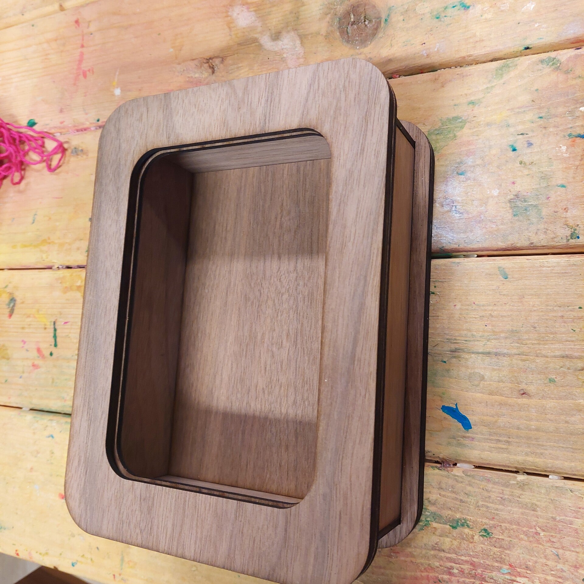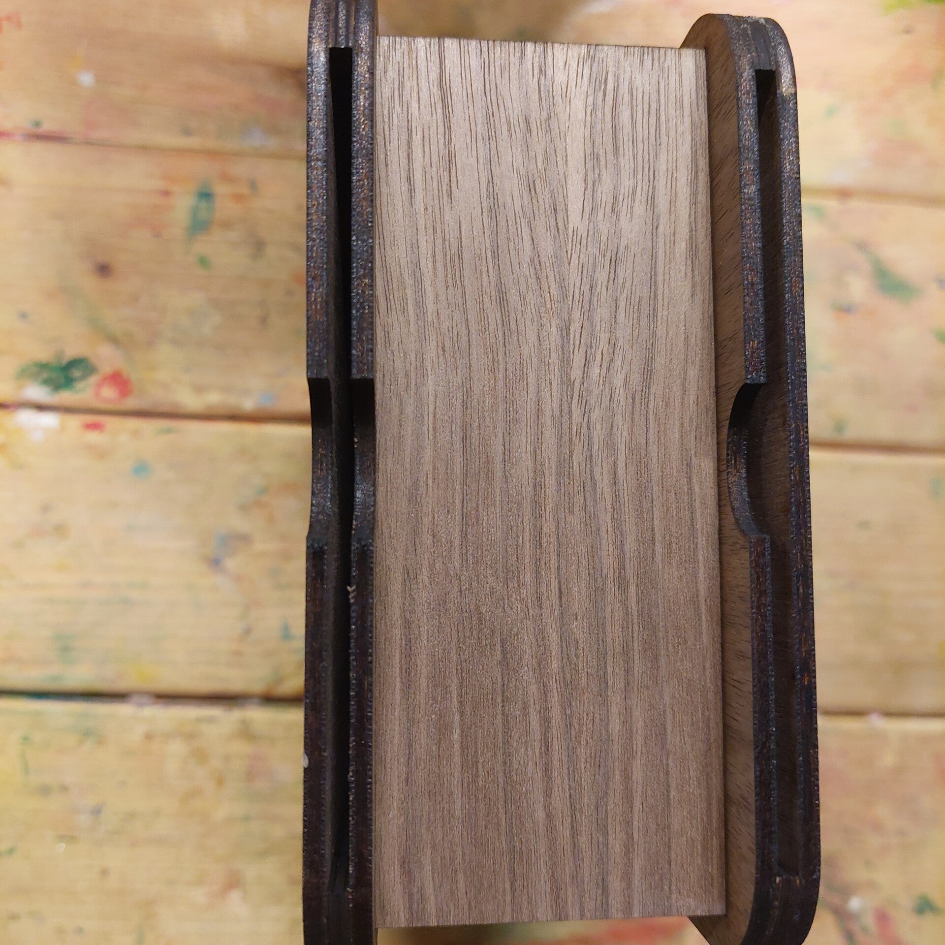 Deze kaartenlamp wordt gemaakt van walnoottriplex. De lamp heeft aan de achterkant een ruimte om 8 kaartjes in op te slaan. Keuze uit wit of zwart snoer van 2 meter met schakelaar. De lamp op de foto's heeft nog geen schakelaar omdat ik die er speciaal voor je in maak na aankoop!